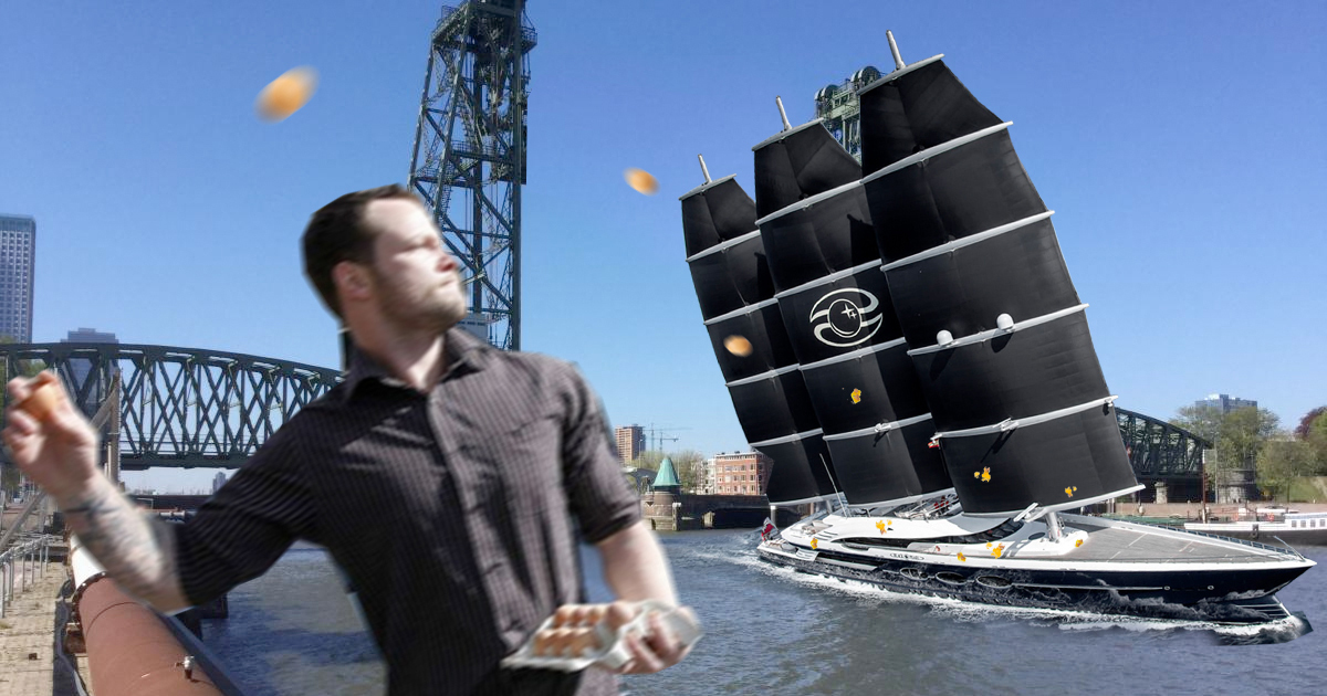 Calling all Rotterdammers, bring a box of (rotten) eggs or if you want to keep it vegan, tomatoes and let’s throw them en masse to Jeff’s superyacht when it sails through the Hef in Rotterdam.