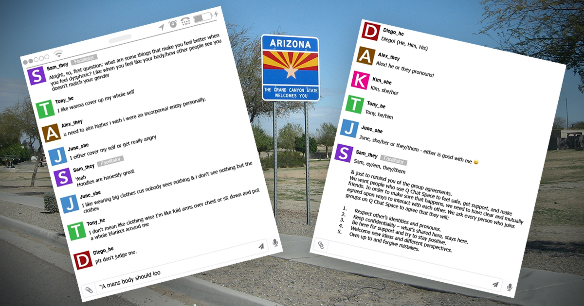 Children in Arizona are directed not only to local and national transgender organisations, but also two online chat groups, Q Chat Space and Gender Spectrum. The first group, Q Chat Space, is a collaboration between Planned Parenthood, CenterLink, and PFLAG.