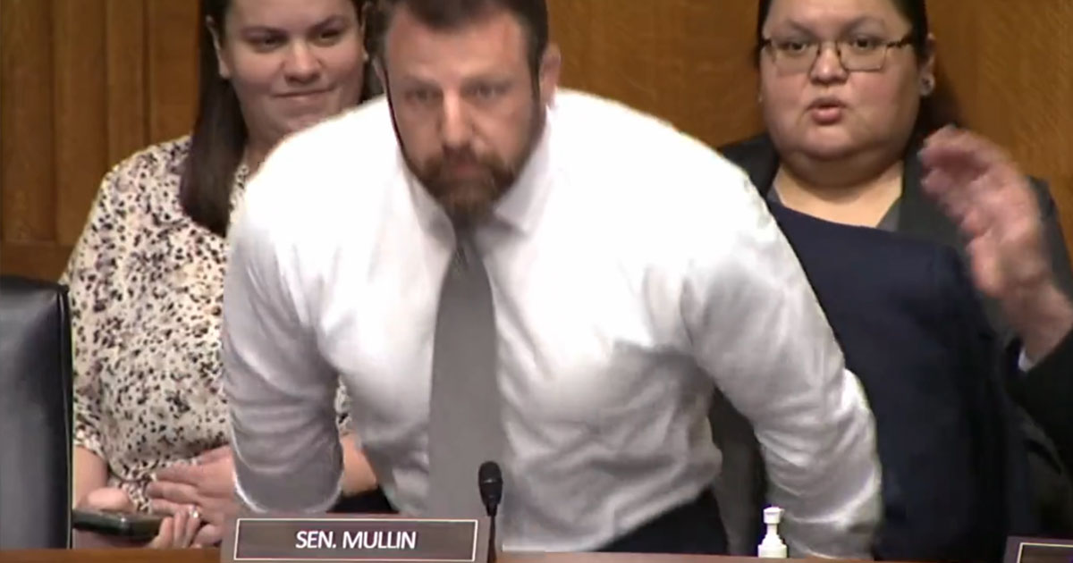 “Well, stand your butt up then,” the senator replied, prompting Mullin to respond, “You stand your butt up, big guy.”